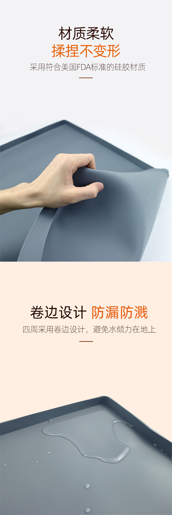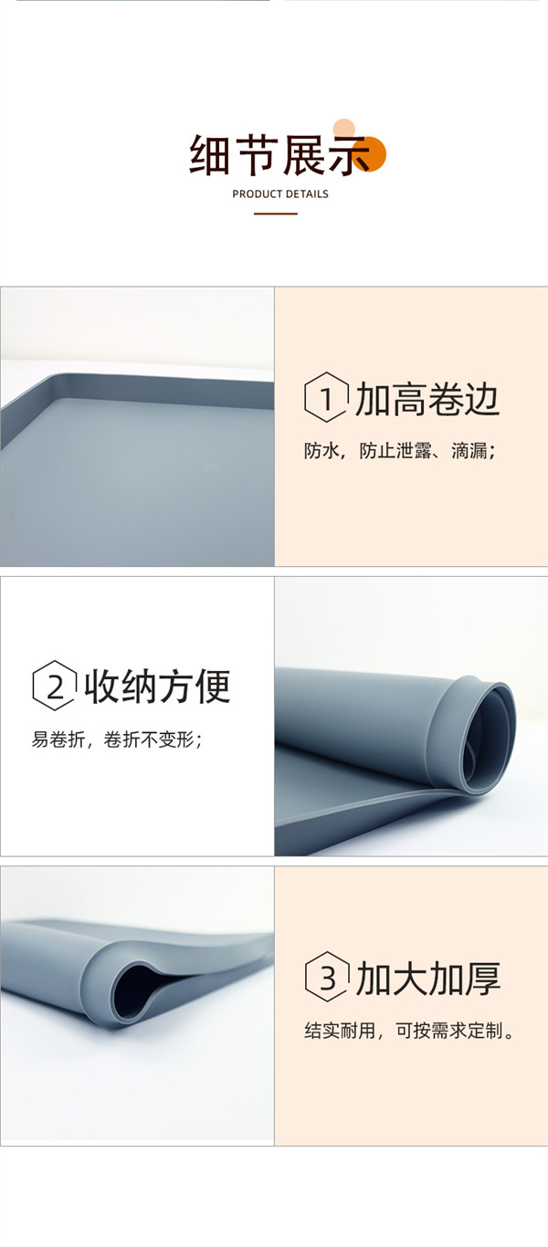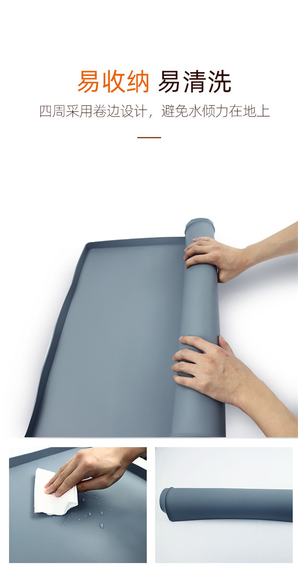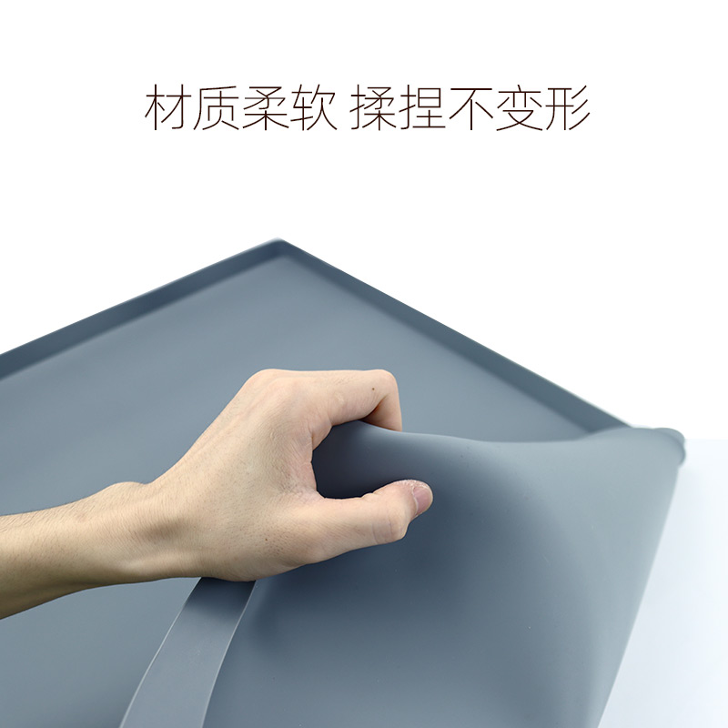 硅膠水槽墊可以在多個不同環境情況下正常使用,產品不僅可以用于下水槽隔水使用,也可以用于家居防滑腳墊以及廚房洗手臺物品收納擺放作用,硅膠材質特性特殊,具備一定的防滑效果和隔熱功能,外圍一圈為擋墻,可以戶外進行物品擺放以及高低溫存放,便于收納以及折疊攜帶等