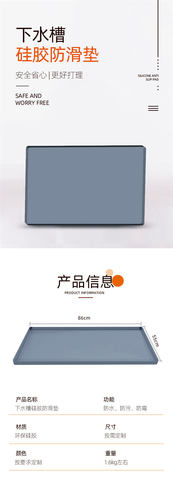 【產品功能】:廚衛防滑防水功能,可用于家庭廚衛下水槽防水,物品存放,產品防滑等功能